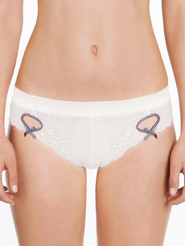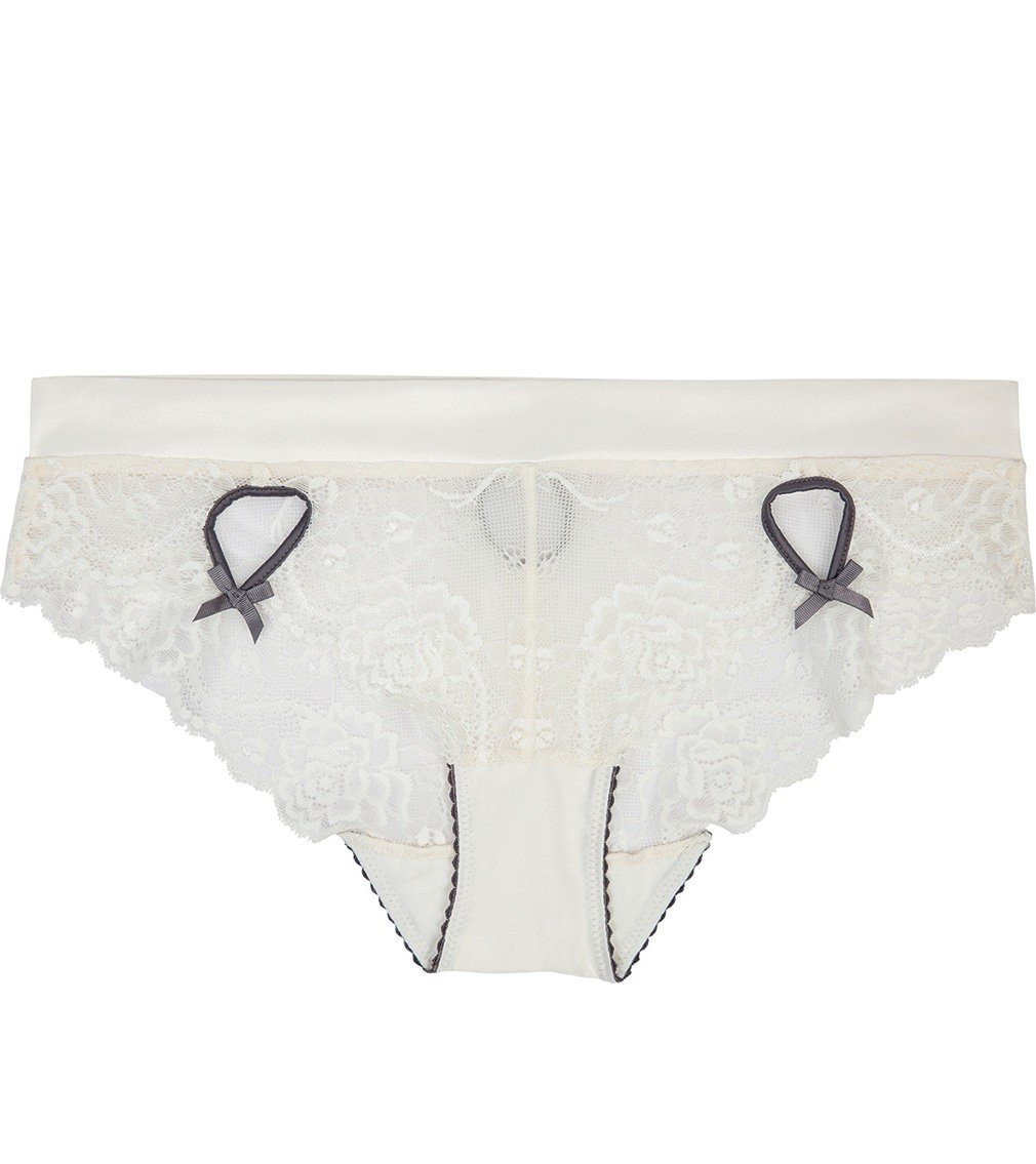 This Sexy Midi Brief by Heidi Klum Intimates features delicate lace with stretch weaved satin details and soft cream/smokey gray.