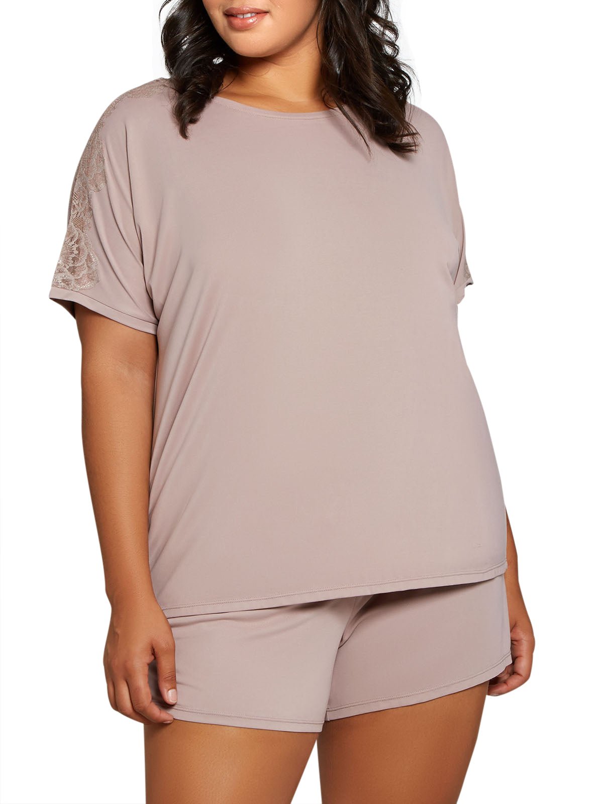 - Features: Short sleeve, Viscose, Floral lace applique at shoulder, Drawstring shorts, Pockets