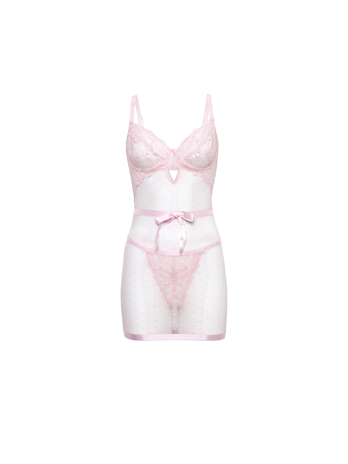 • Make any night unforgettable with the Josie Bow Lace Babydoll Dress—a dreamy lace babydoll lingerie piece designed to highlight your curves with style & comfort. Crafted from soft, sheer pin dot mesh, this pink lace babydoll dress features a playful waist bow that adds a flirty touch & accentuates your curves. With unlined underwire cups & adjustable straps, it offers just the right amount of lift & fit, creating a look that’s effortlessly alluring. Perfect for special occasions or anytime you want to feel irresistibly seductive!