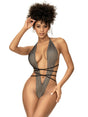 The monokini of your dreams in a fishnet texture. Highlight your curves in this deep plunge one piece swimsuit with high cut, thong coverage and complete adjustability.