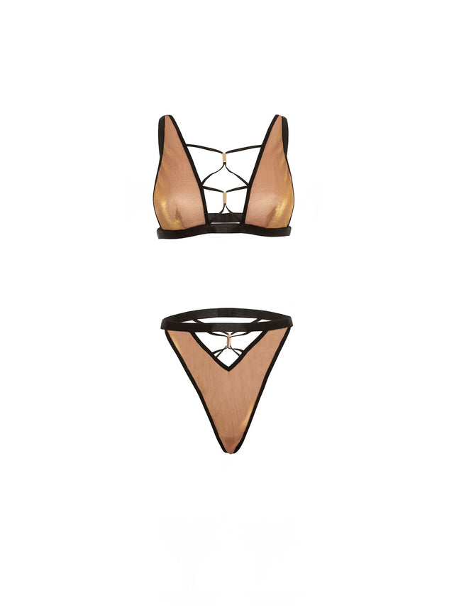 Get ready to shine with our Jade Iridescent Bra Set! Featuring a soft cup and wide adjustable shoulder straps for ultimate comfort and support. The iridescent mesh and gold beaded hardware trim add a touch of glamour, while the open back panty adds a playful and sexy twist.