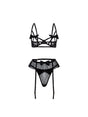 Indulge in the Kimia Bow 3 Piece Bra Set, a luxurious and elegant gift for any occasion. This set includes a gorgeous underwire bra with cage embellishments for a daring peek-a-boo effect, complemented by charming bow accents. The included panty features a satin and dot mesh design, complete with an adjustable garter for a touch of sweetness. With delicate strappy cage detailing on the back of the thong, this set exudes sophistication and exclusivity.  Perfect for a gift, New Years, Valentine's Day and anniversaries.