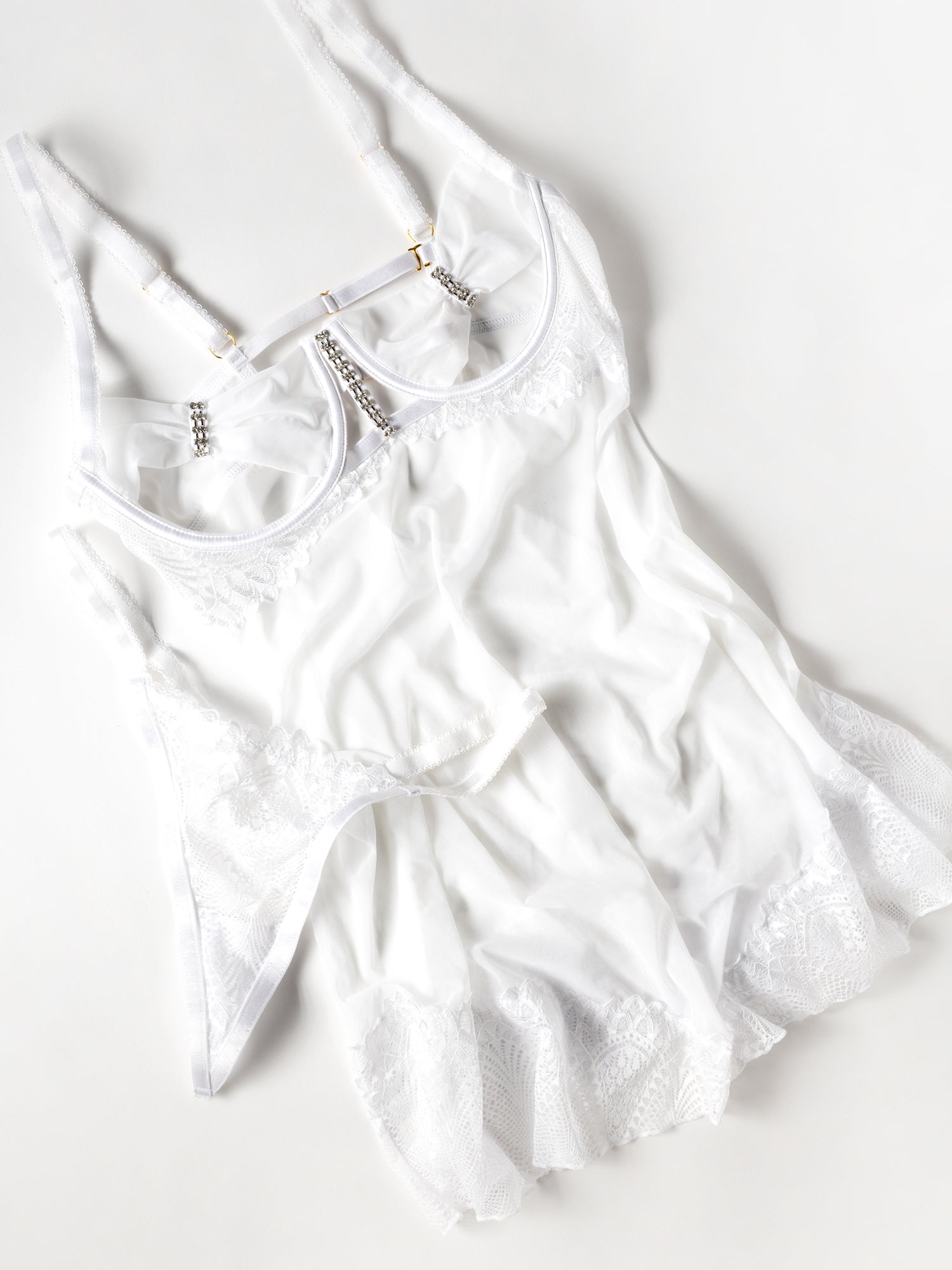 Peek-A-Boo Unlined Underwire Cup Babydoll With Ruching And Rhinestone Details And Matching G-String