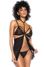 A revealing lace bodysuit that transforms into a babydoll with a detachable skirt you can snap on or off whenever you desire. Lace body has a strappy design, open back and adjustable straps, Skirt is mesh with front opening. Loose silhouette.