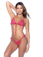 This playful two-piece bikini in an eyelet print features adorable ruffle details, with a front-tie top and a matching thong bottom.
