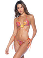 A two-piece swimsuit in a realistic crochet print, featuring a top with crochet floral appliqué and an additional waist tie at the center for a flattering silhouette. The matching side-tie thong bottom completes the look, making it perfect for a relaxed day at the beach.