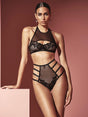 This bra top from the Bracli London Collection is delicate, feminine, and ultra-flattering. It is crafted from semi-sheer floral-patterned black lace and tulle materials with alluring golden metal detailing. A keyhole cutout in front and a high-neck halter neckline draws attention to your bust and effortlessly enhances your cleavage.