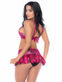 This flirty two-piece set in a bold fuchsia snake print is designed to turn heads. It features a top with adjustable straps and underboob cut-outs, paired with a matching ruffle mini skirt for a fun and fierce look.