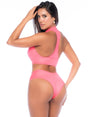This eye-catching two-piece set in wet-look pink complements every skin tone. It features a top with functional metal snap buttons and a flattering keyhole design, paired with a matching medium-coverage bottom.