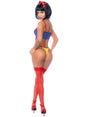 Embody the character in this four-piece poisoned apple princess costume, featuring a top with adjustable straps and a front lace-up design, a thong with bow detail, and a ribbon headpiece and neckpiece.