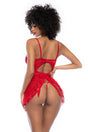 A playful babydoll with lace and sheer mesh contrasts. Includes underwire, adjustable straps, back-tie opening, ruffle trims and matching thong with heart accessory. Semi-fitted silhouette.