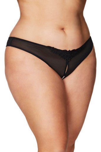 There is no doubting why the Paradise thong is our TOP SELLING PANTY! This thong is a tasteful blend of exquisite and seductive. The hip-hugging, light mesh body is decorated with an intricate Venise lace applique. The lace detail forms an alluring silhouette leading to the most prominent feature of this piece; the open gusset embellished with a string of glistening pearls.