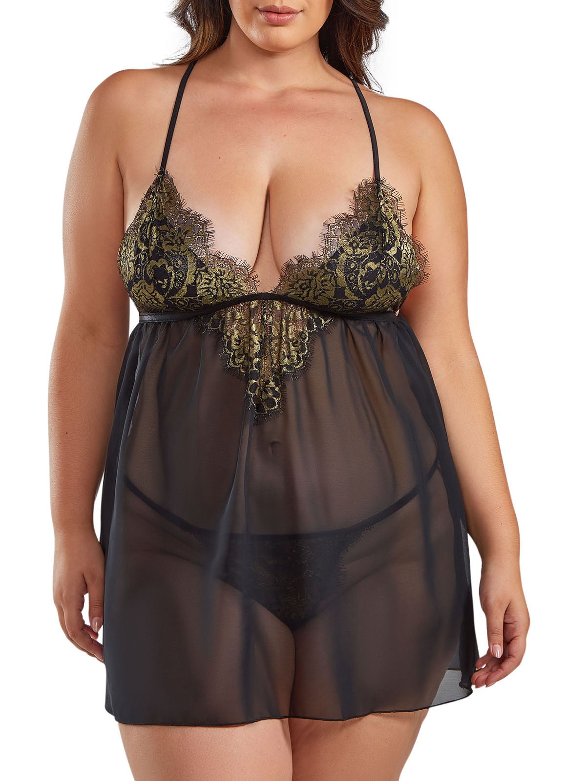 Plus Size Plunging Lace Mesh Babydoll Dessous Set - Gold-Black / 1X ist auf Lager und wird versandt, sobald es wieder verfügbar ist