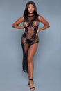 Step into the season with our All Night Long floral bodystocking dress, a breathtaking blend of classic femininity and modern style. Adorned with a floral pattern and sheer mesh that shows what's beneath and an alluring side slit that adds a touch of sensuality to this dress. High neckline Sleeveless Side slit Raw seam Mid-length Thong and pasties not included