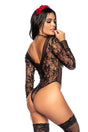 Sexy Catrina costume. Includes printed mesh bodysuit with floral lace back and sleeves, lace collar and head piece.