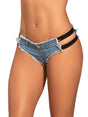 Light denim micro shorts with elastic side tabs, frayed edges and faux buttoned clousure.