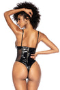 Introducing your new favorite vinyl bodysuit. With fishnet details on the sides to enhance your curves. Plunge neckline with all the support of underwire, adjustable straps, back zipper closure, Brazilian coverage and adjustable crotch fastening.
