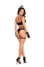 Sexy police costume. Includes top with V-separator neckline and adjustable straps, matching thong in a wet look fabric, elastic garter, gloves and head piece.
