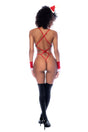 Heat things up on cold Christmas nights with this polka-dot mesh bodysuit with a strappy back design. Includes gloves with feather trims and hat head piece. Adjustable crotch fastening.