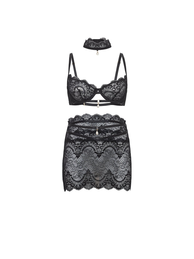 This is the quintessential lingerie ensemble. The Perla consists of a 3-piece lace bra and matching skirtini, both embellished with a pearl-adorned lace choker. This luxurious set exudes sensuality, elegance, and refinement.
