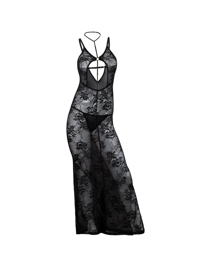 Unleash your wild side with the Presley Choker Lace Gown! Made of soft stretch lace, this daring stretchy sleep gown features an open center and attached harness collar. Wear it to bed, lounging around or for the ultimate seduction. Take a risk and make a bold statement with Presley!